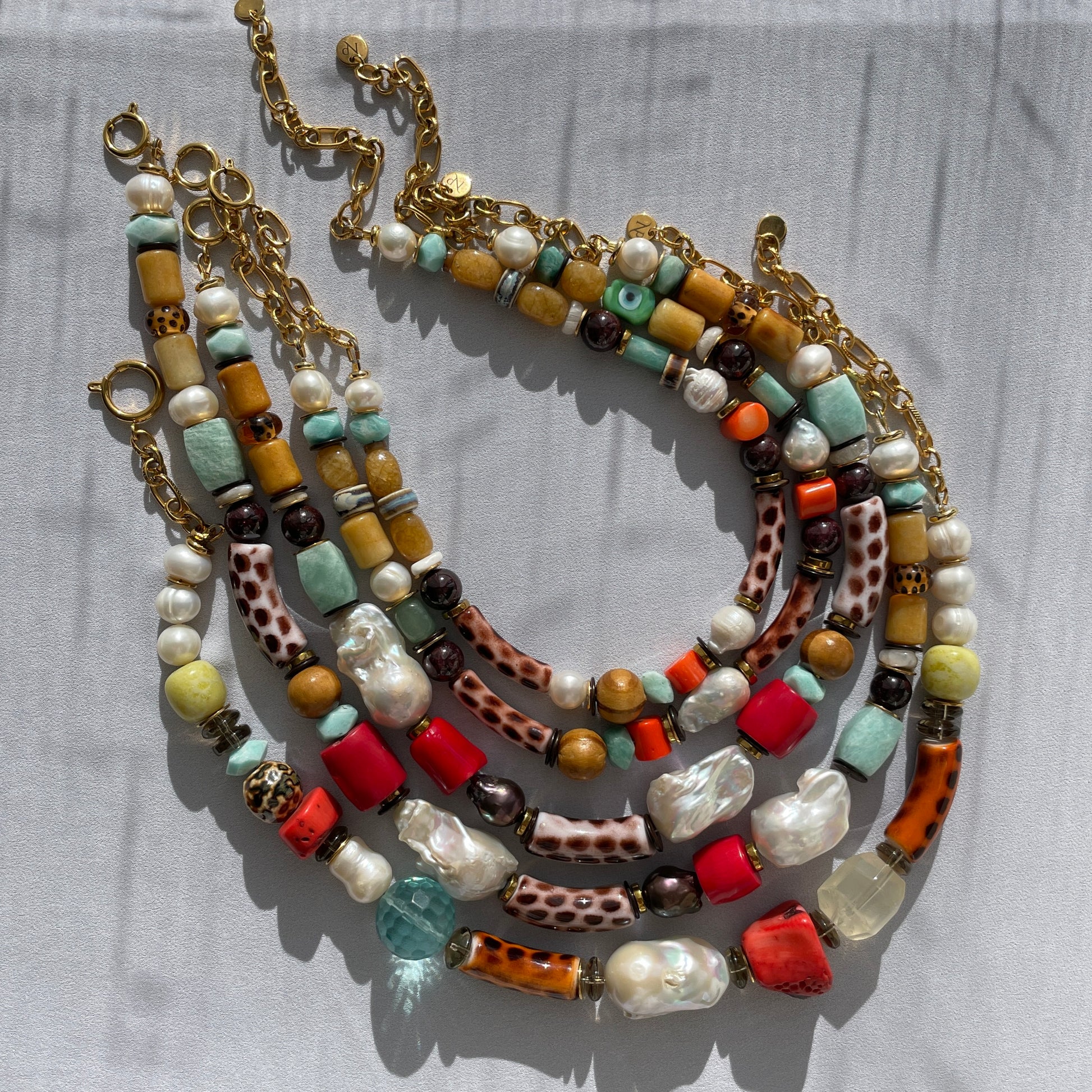 This exquisite necklace features a stunning array of natural stones, beautifully strung together to create a vibrant and unique piece. The necklace showcases the captivating hues of agate, ceramic, and topaz, complemented by the rich warmth of coral and the iridescent luster of baroque pearls.